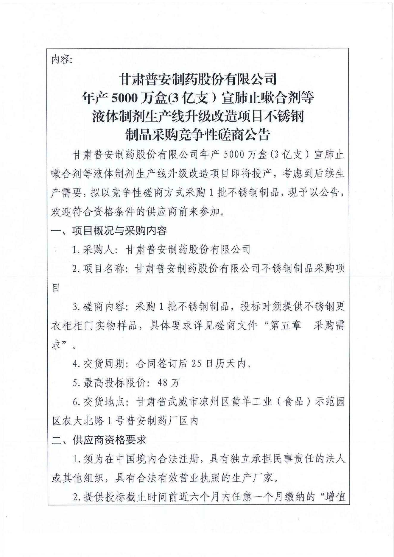 甘肅普安制藥股份有限公司年產(chǎn)5000 萬盒(3億支)宣肺止嗽合劑等液體制劑生產(chǎn)線升級改造項目不銹鋼制品采購競爭性磋商公告