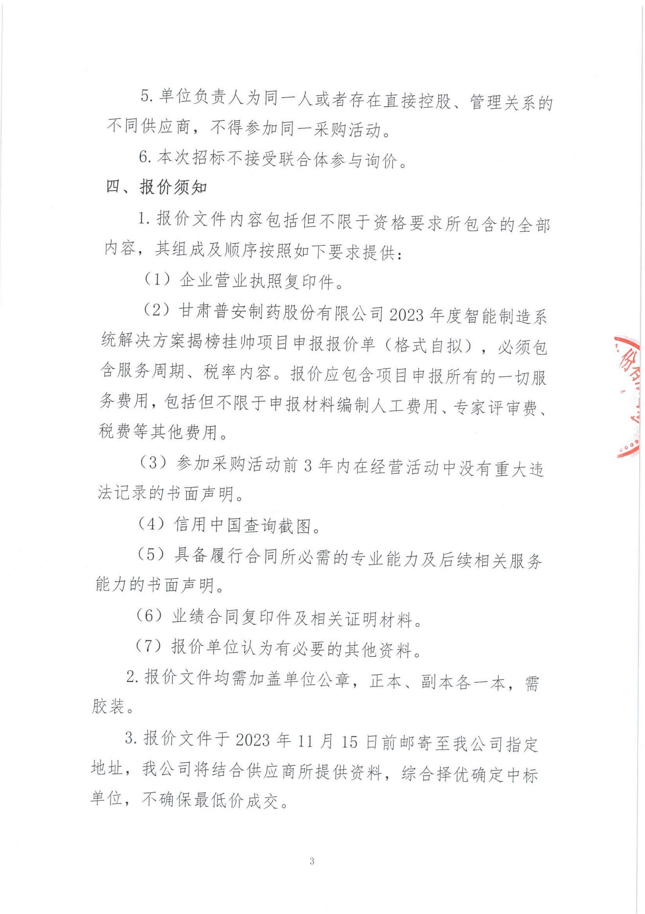 甘肅普安制藥股份有限公司關(guān)于委托第三方申報(bào)2023年度智能制造系統(tǒng)解決方案揭榜掛帥項(xiàng)目報(bào)價(jià)邀請(qǐng)公告