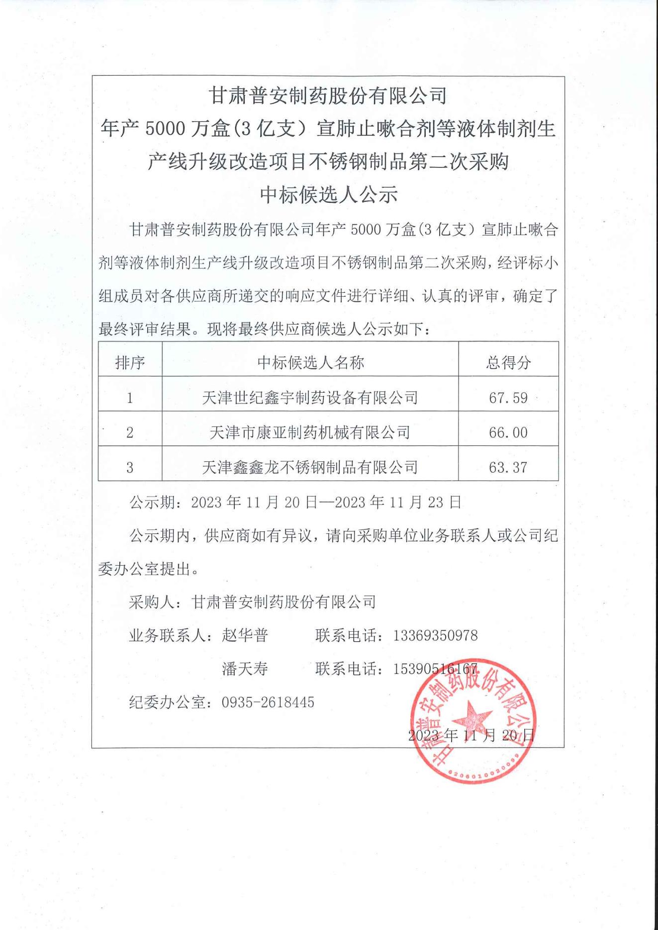 甘肅普安制藥股份有限公司年產(chǎn)5000萬盒(3 億支)宣肺止嗽合劑等液體制劑生產(chǎn)線升級改造項(xiàng)目不銹鋼制品第二次采購中標(biāo)候選人公示