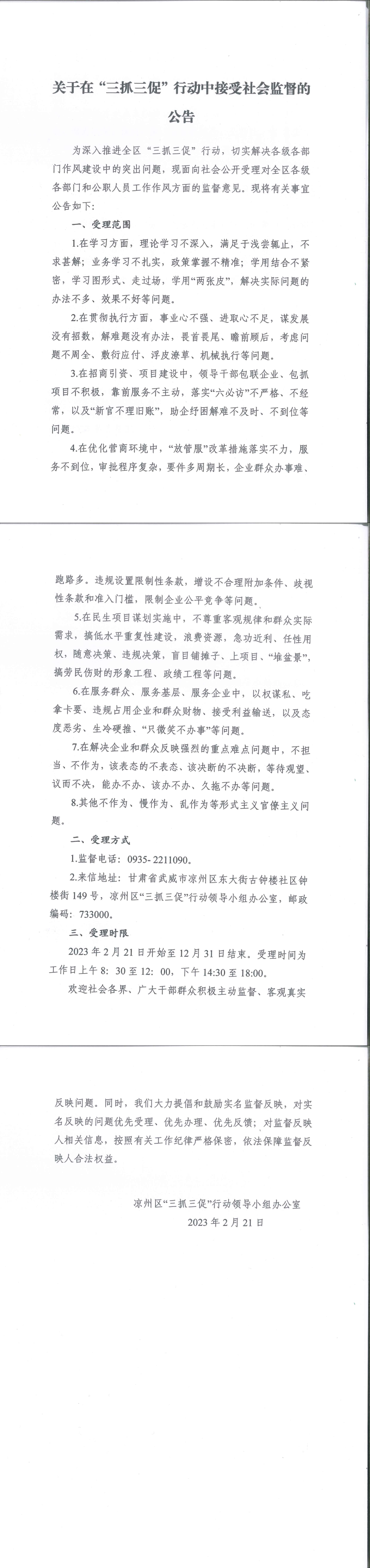 關(guān)于在“三抓三促”行動中接受社會監(jiān)督的公告