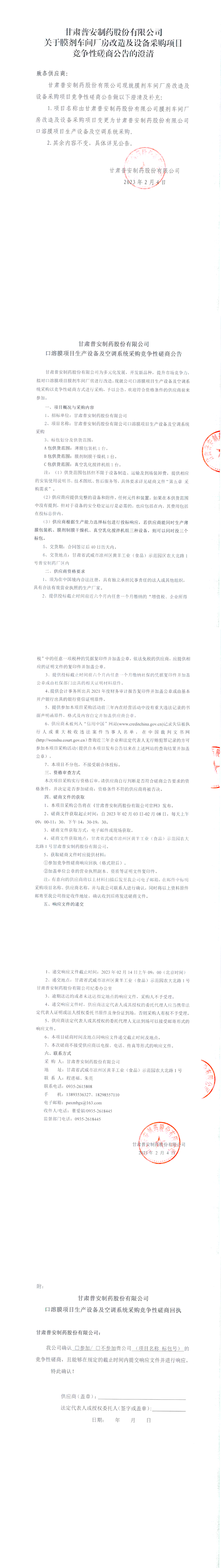 甘肅普安制藥股份有限公司關于膜劑車間廠房改造及設備采購項目競爭性磋商公告的澄清