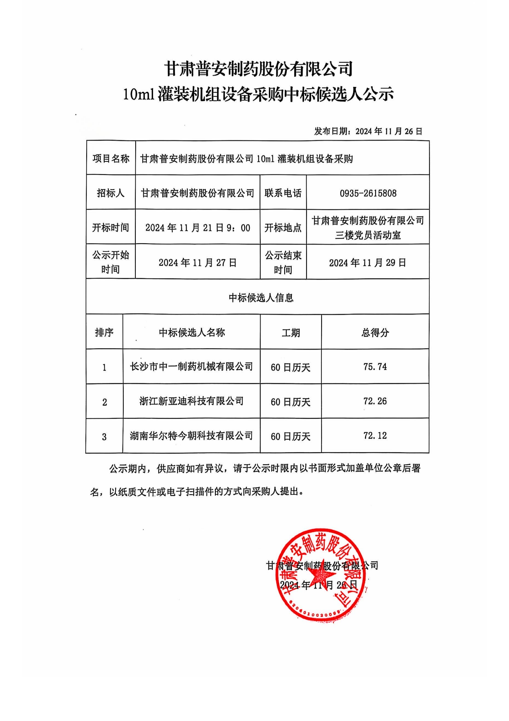 甘肅普安制藥股份有限公司10ml 灌裝機(jī)組設(shè)備采購(gòu)中標(biāo)候選人公示