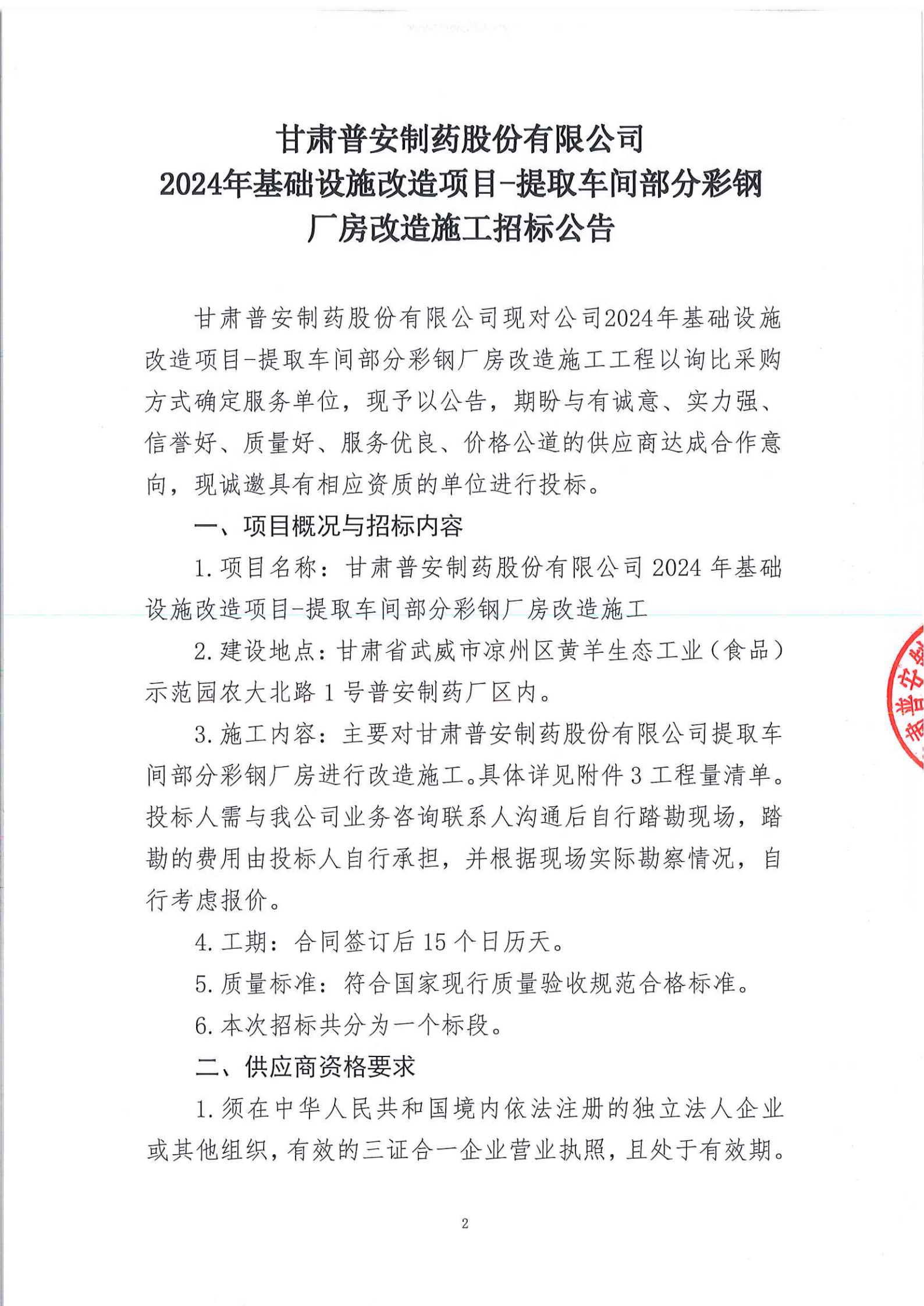 甘肅普安制藥股份有限公司2024年基礎(chǔ)設(shè)施改造項(xiàng)目-提取車間部分彩鋼廠房改造施工招標(biāo)公告