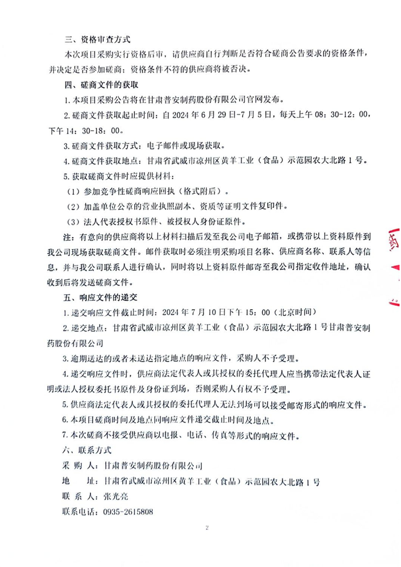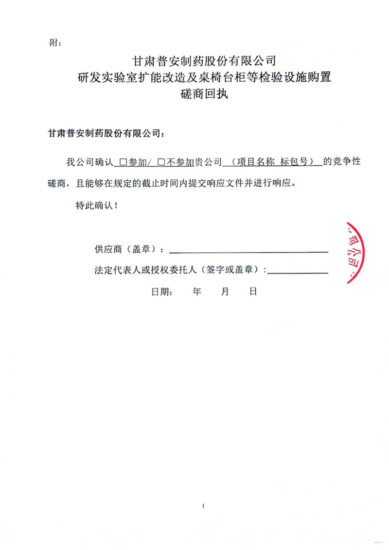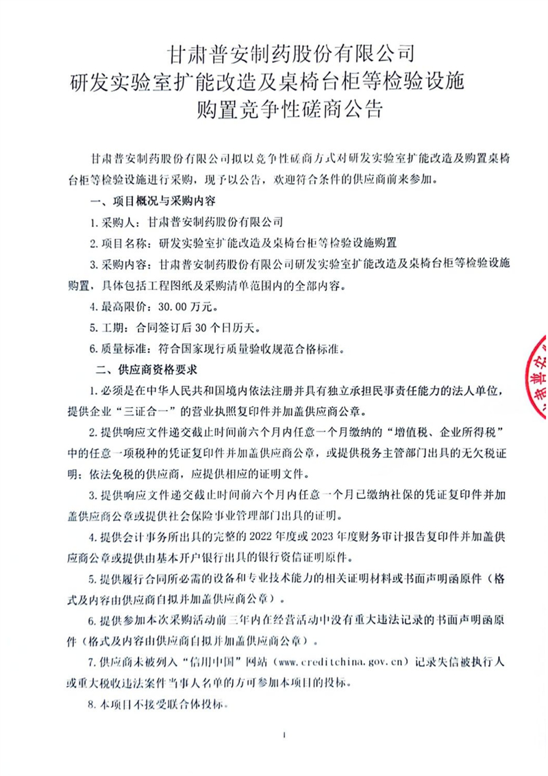 甘肅普安制藥股份有限公司研發實驗室擴能改造及桌椅臺柜等檢驗設施購置競爭性磋商公告