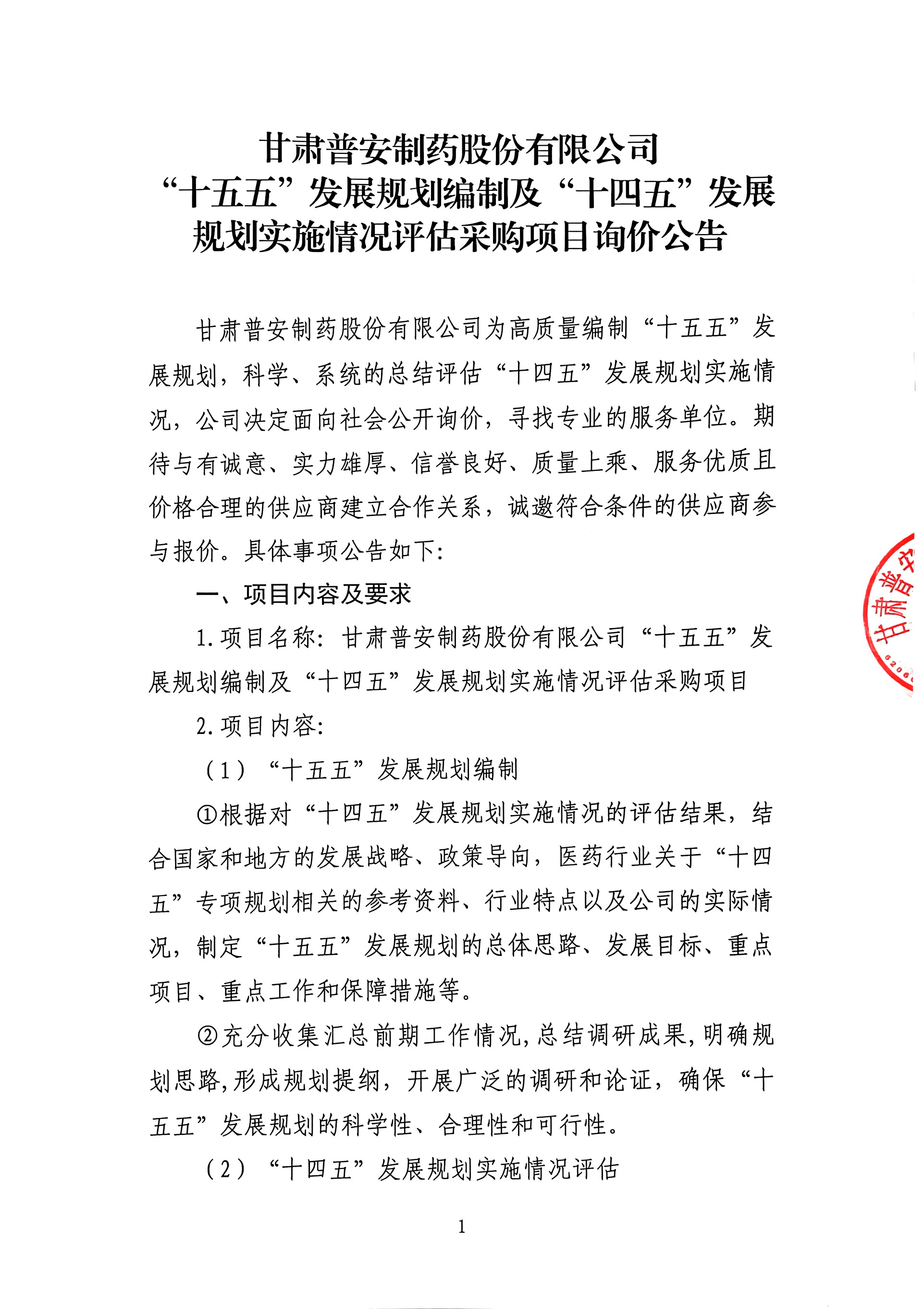 甘肅普安制藥股份有限公司“十五五”發展規劃編制及“十四五”發展規劃實施情況評估采購項目詢價公告