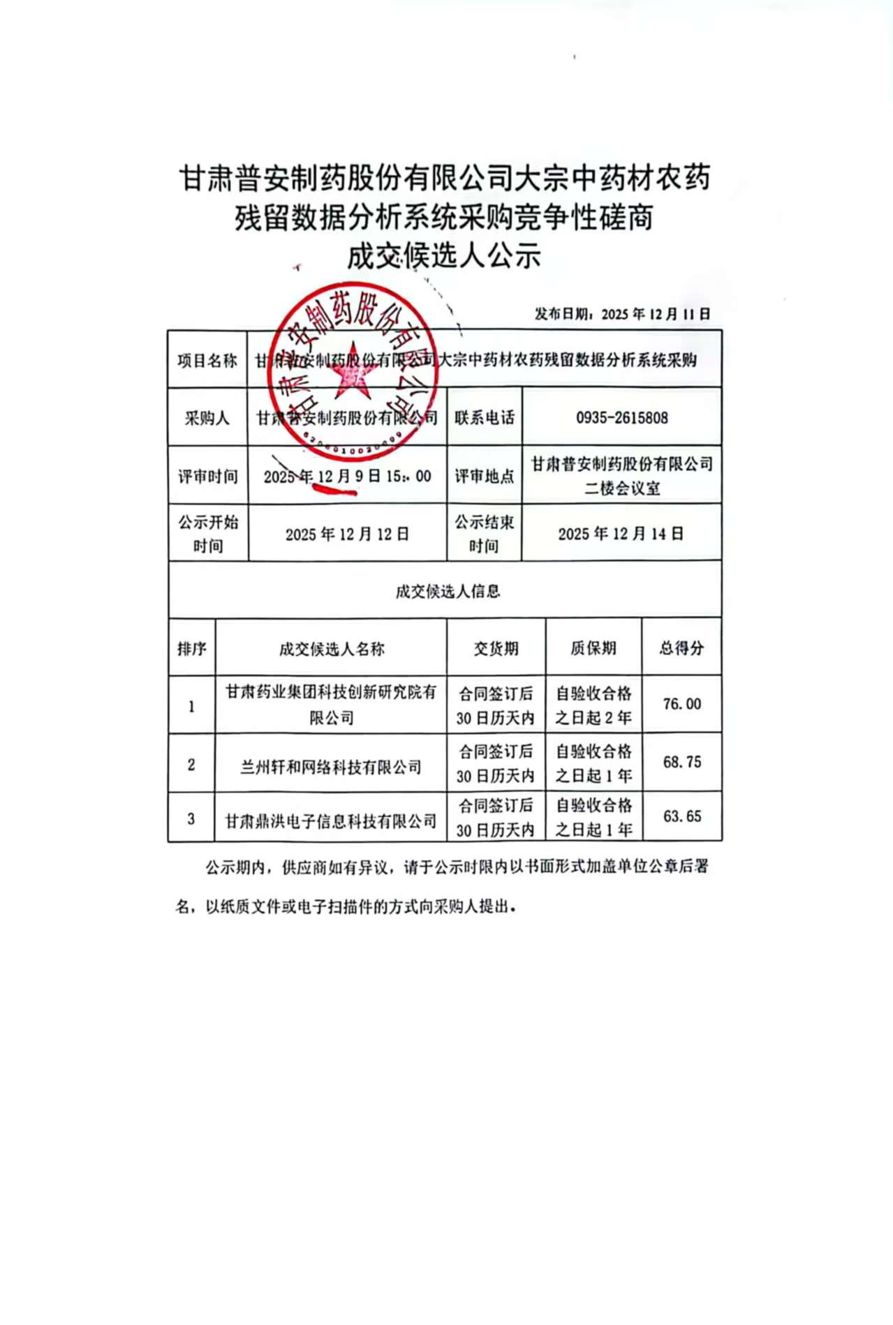 甘肅普安制藥股份有限公司大宗中藥材農藥殘留數據分析系統采購競爭性磋商成交候選人公示