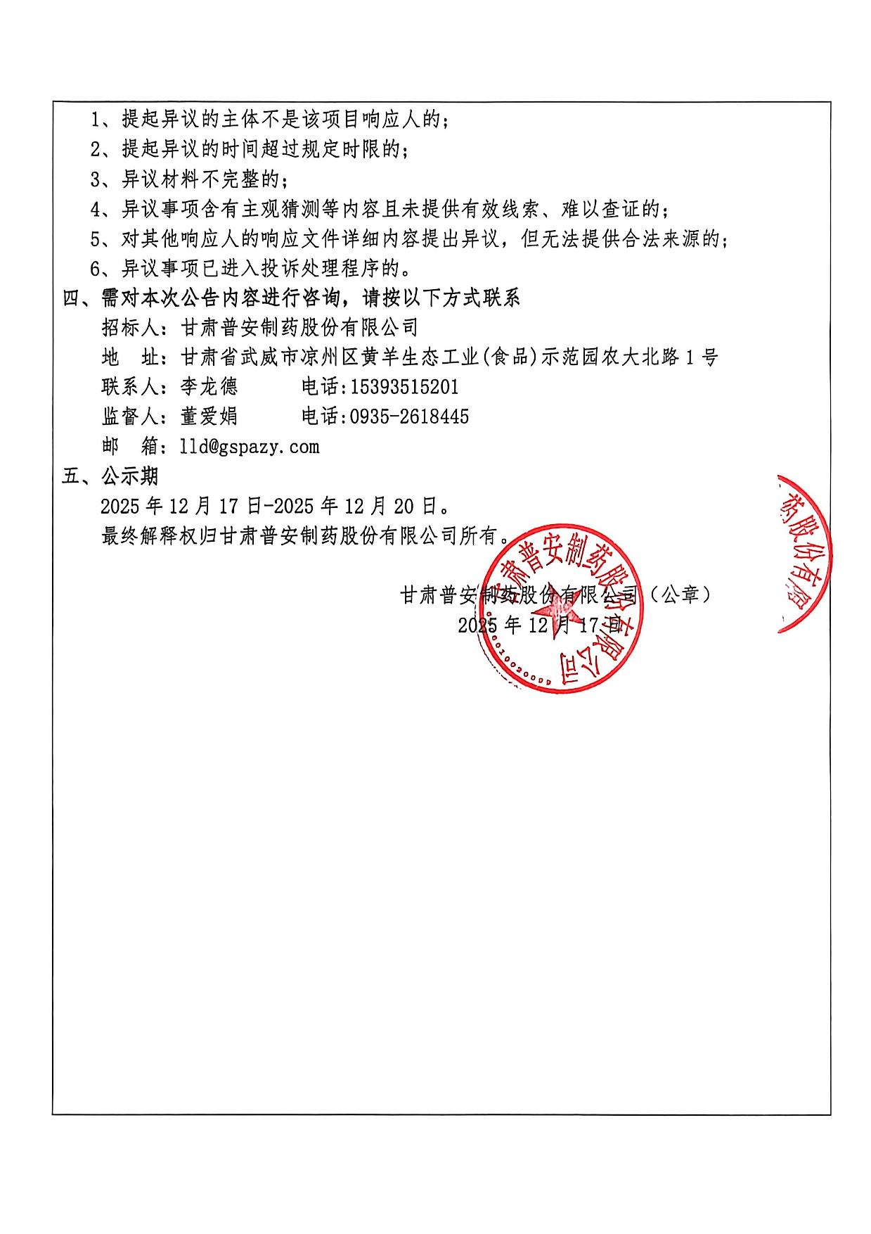甘肅普安制藥股份有限公司2026年度宣肺止嗽合劑中藥材采購評審結果公示