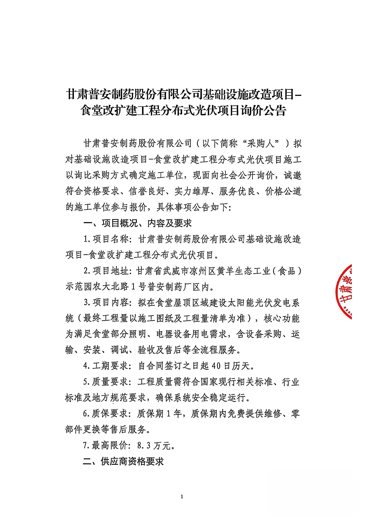 甘肅普安制藥股份有限公司基礎(chǔ)設(shè)施改造項目-食堂改擴(kuò)建工程分布式光伏項目詢價公告